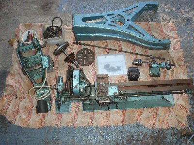 My late fathers Myford ML4 - 3.5" x 23" gap-bed, backgeared and screwcutting lathe. It has its own stand and tray. It was working fine before I brought it home, dismantling it to movable lumps. How complete the assesories are I am not sure, it would be a case of you inspecting what I have. It has a 3 jaw self centering chuck - the only one with it, a faceplate and tailstock with centre and drill chuck, a set of change gears and a selection of tools etc. (including a manual). It has been converted to a V belt drive with a high level motor (suspect off a bench top model). I need to create some space for a 'new to me' lathe I have recently purchased. Must be worth a £200